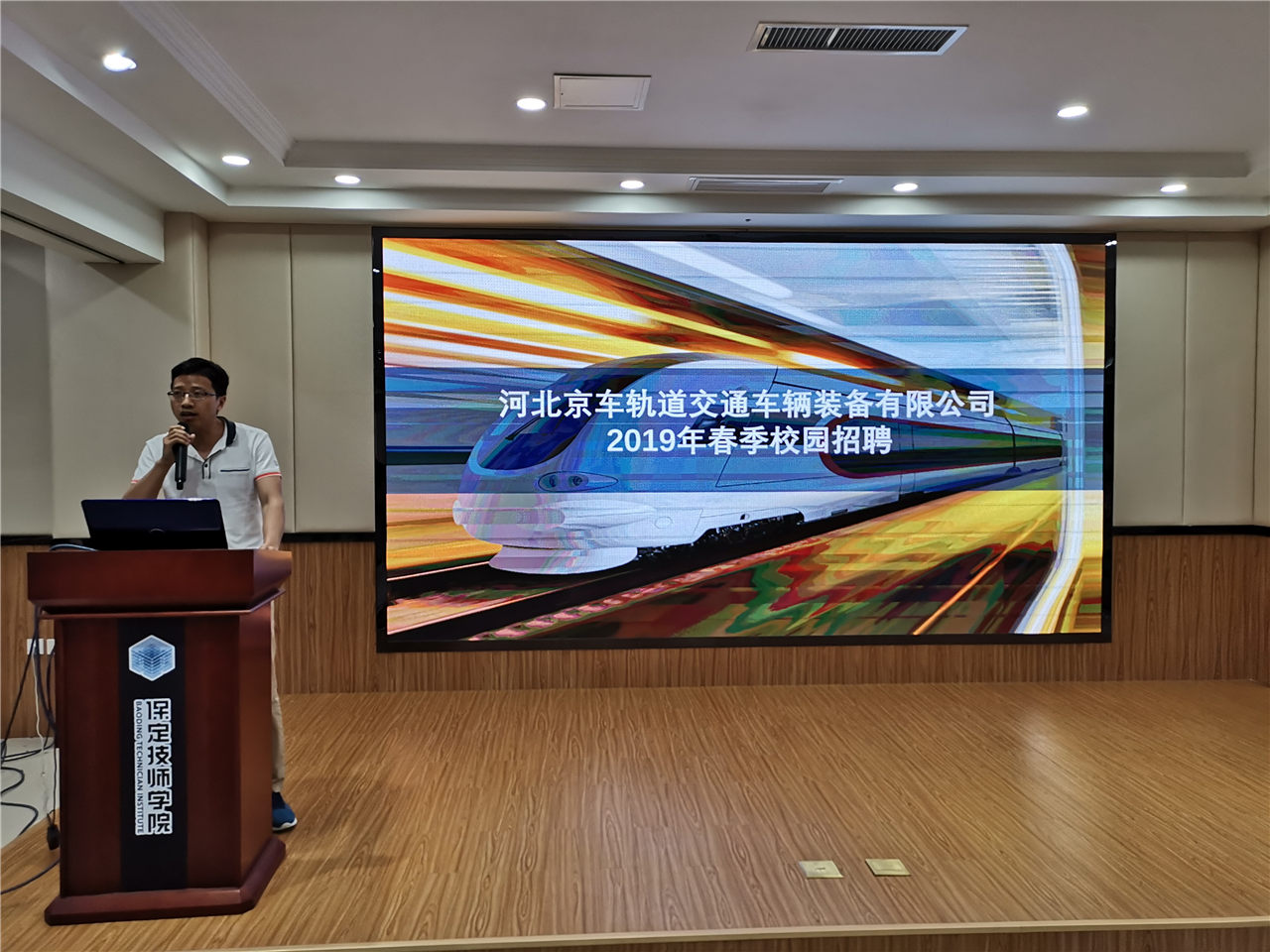 河北京車公司招聘負責人首先從公司的主營業(yè)務、發(fā)展方向、企業(yè)文化、福利待遇等多個方面向學生們作了詳細宣講。隨后,對同學們所關心的問題一一作了詳細解答。通過一對一面試,最終決定錄用機電、電氣、數(shù)控三個專業(yè)共51名學生。