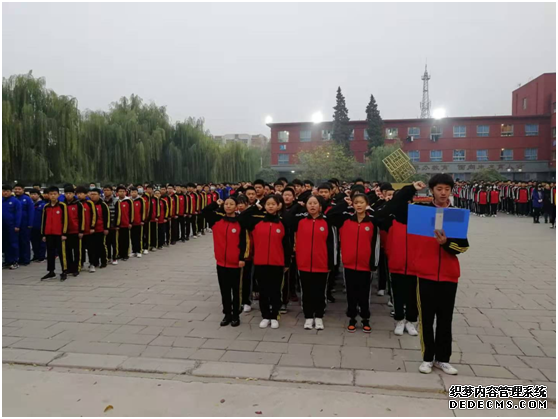 隨后,全體身著校服新團(tuán)員,伴著雄壯的團(tuán)歌入場(chǎng),在團(tuán)員代表王梓霖同學(xué)的帶領(lǐng)下面對(duì)鮮紅的團(tuán)旗,右手握拳,手舉過肩,以最宏亮的聲音進(jìn)行莊嚴(yán)宣誓:我志愿加入中國(guó)共產(chǎn)主義青年團(tuán),堅(jiān)決擁護(hù)中國(guó)共產(chǎn)黨的領(lǐng)導(dǎo),遵守團(tuán)的章程,執(zhí)行團(tuán)的決議,履行團(tuán)員義務(wù),嚴(yán)守團(tuán)的紀(jì)律,勤奮學(xué)習(xí),積極工作,吃苦在前,享受在后,為共產(chǎn)主義事業(yè)而奮斗!在高喊出自己名字的那一刻,新團(tuán)員們肩負(fù)起作為一個(gè)團(tuán)員光榮而神圣的使命擔(dān)當(dāng),全體團(tuán)員響亮的誓言也在操場(chǎng)久久回蕩。在此期間,其他方隊(duì)的老團(tuán)員也自覺緊握右拳,面向團(tuán)旗重溫入團(tuán)誓詞,用這樣的方式表達(dá)自己團(tuán)員義務(wù)和責(zé)任。