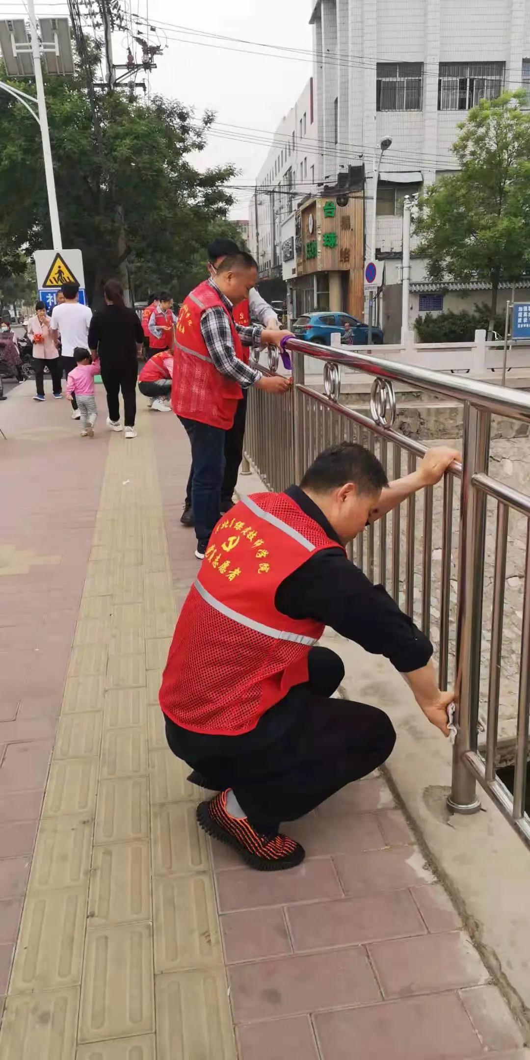 活動(dòng)中,支部黨員志愿者按照分工安排,穿上紅馬甲,帶上勞動(dòng)工具,來(lái)到大橋兩側(cè),清理欄桿上的小廣告、捆綁鐵絲、銹跡污物,最后分工仔細(xì)擦拭欄桿,使得永華南橋兩側(cè)欄桿煥然一新?;顒?dòng)中,馬路上的行人紛紛駐足觀看,對(duì)志愿者舉手點(diǎn)贊。