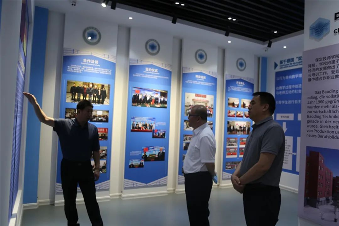 伊洪良董事長一行首先到中德職業(yè)合作項目展覽館參觀,崔欣院長介紹有關(guān)情況。
