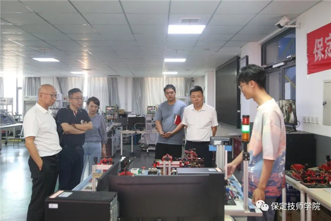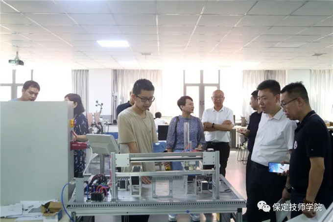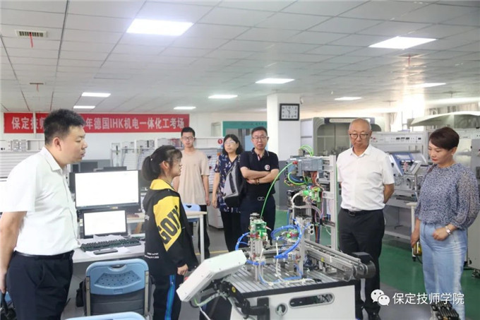 然后,到二樓電氣實訓(xùn)車間參觀,車間負(fù)責(zé)老師介紹了實訓(xùn)設(shè)備的使用、技能大賽參賽備賽以及中德機電一體化合作實驗班中期考試的具體情況。