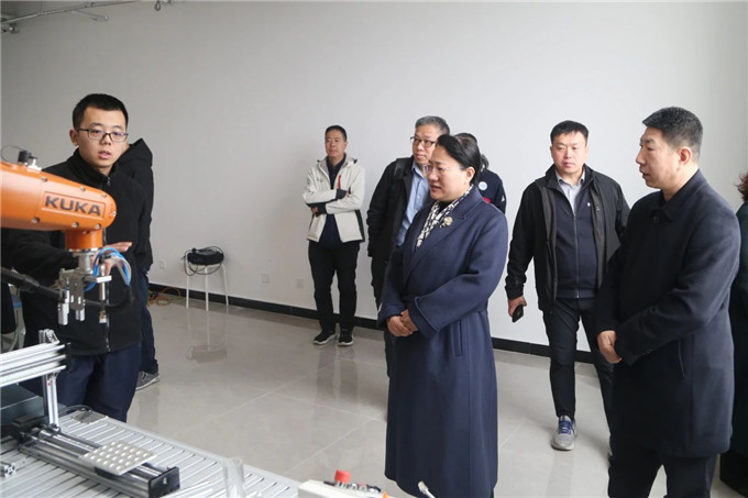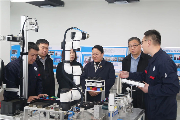 隨后,調(diào)研組來(lái)到中德合作實(shí)訓(xùn)基地,實(shí)地觀摩了數(shù)控加工、工業(yè)機(jī)器人等現(xiàn)代化實(shí)訓(xùn)車間。崔欣院長(zhǎng)表示,中德合作項(xiàng)目通過(guò)引入德國(guó)“雙元制”教學(xué)模式和行業(yè)標(biāo)準(zhǔn),已培養(yǎng)出一批高技能應(yīng)用型人才,并特別感謝楊偉坤院長(zhǎng)在項(xiàng)目申報(bào)、資源對(duì)接等方面給予的關(guān)注和支持。