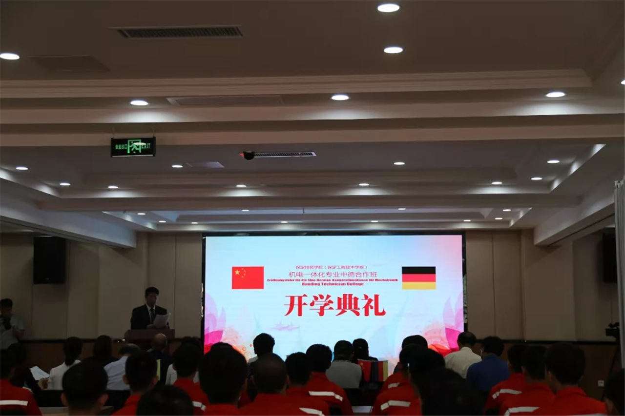 今天上午,保定技師學院首屆機電一體化專業(yè)中德合作班開學典禮在學院綜合樓三樓多功能廳舉行。河北省人力資源和社會保障廳副廳長趙愛平、職業(yè)能力建設處處長馬永飛,德國南圖林根手工業(yè)協(xié)會副會長拉德維希,保定市人民政府副市長楊偉坤,市政府辦公廳副秘書長張曉霞,市人力資源和社會保障局局長楊小寧,市教育局副局長邢智麗,市人力資源和保障局副局長孫福君、李榮耀,市政府辦公廳、市財政局、市人社局等有關處室負責同志出席開學典禮。北京德信合力,保定長城汽車、立中集團、新大長遠等有關企業(yè)的負責同志也參加了開學典禮。院長崔欣主持。