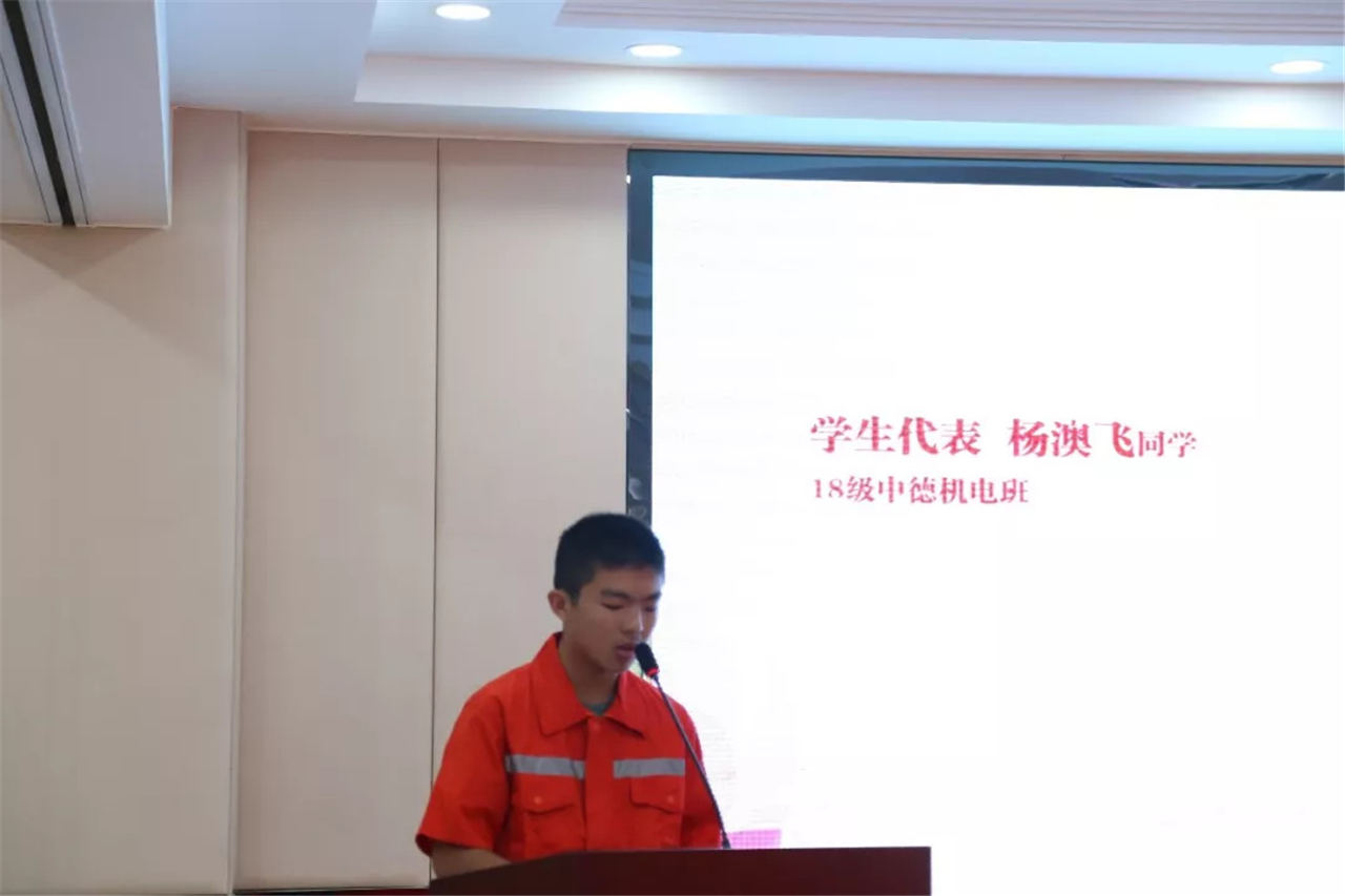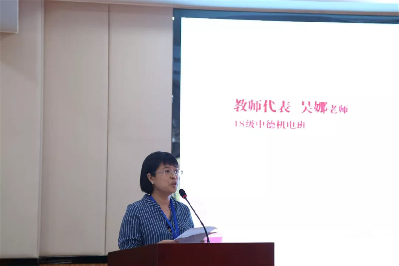 吳娜老師代表全體教師發(fā)言,希望同學們成為“學習上的奮斗者”,同學之間相互幫助,相互競爭,共同提高;希望同學們成為“遵規(guī)守紀的職業(yè)人”,嚴格要求自己,爭做熱愛工作、精益求精的準員工;希望同學們成為“有幸福能力的好公民”。