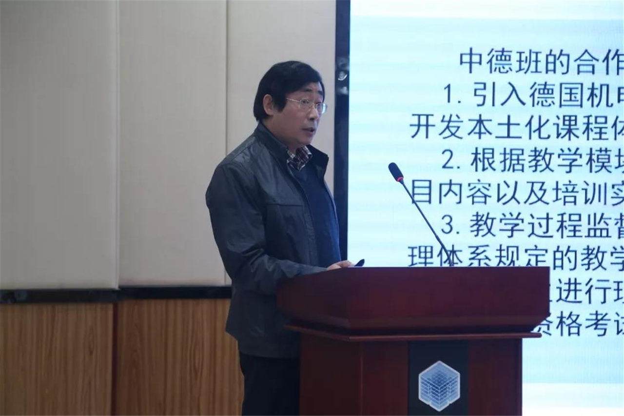 保定技師學院教務處處長崔志鋒做中德國際班教學報告。他主要介紹了機電一體化中德合作班的合作內(nèi)容,以及德國的課程體系在本土化過程中遇到的主要困難。我院在引進德方教學模塊的基礎上,組織專業(yè)老師自主開發(fā)出承載教學大綱的教學項目。
